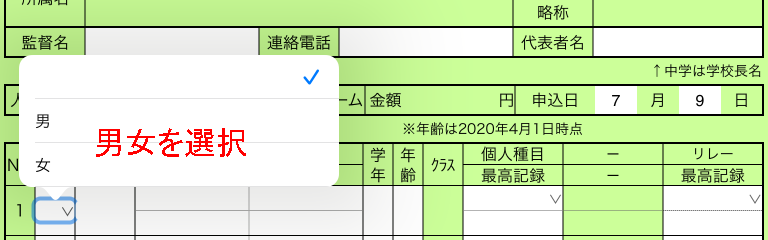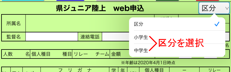 右側にv印のある枠(区分,性別,個人種目,リレー)は,選択入力です。