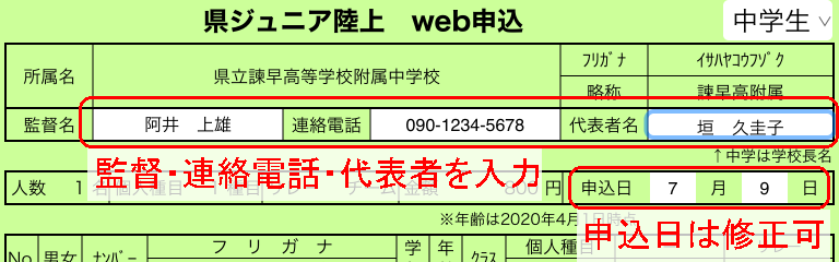 競技者欄のナンバーカードを入力すると,氏名,学年が自動的に入ります。