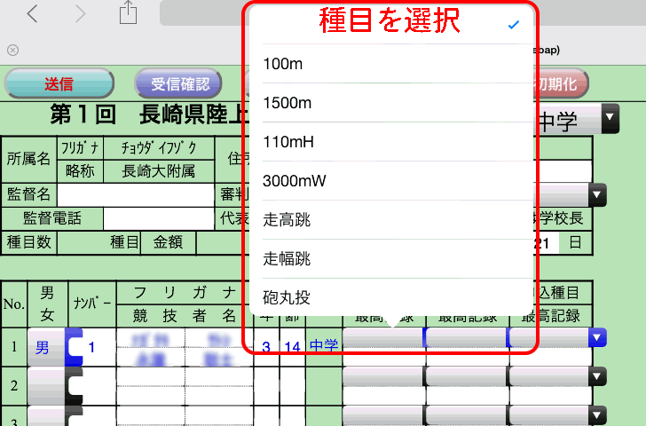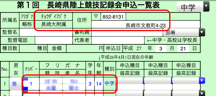 競技者欄のナンバーカードを入力すると,氏名,学年が自動的に入ります。