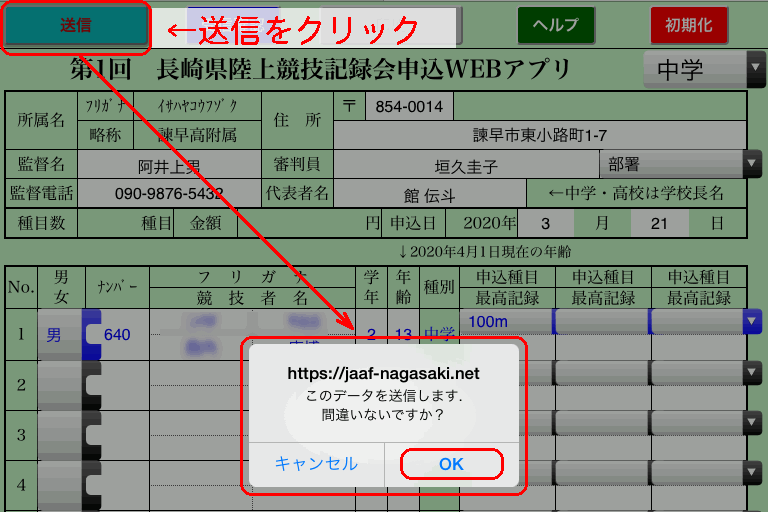 確認のメッセージが出たら,「OK」をクリックするとデータが送信されます。